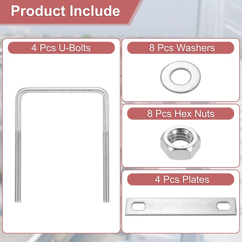 Packaging: 4 x U-bolts, 8 x Hex Nuts, 4 x Plates, 8 x Washers
