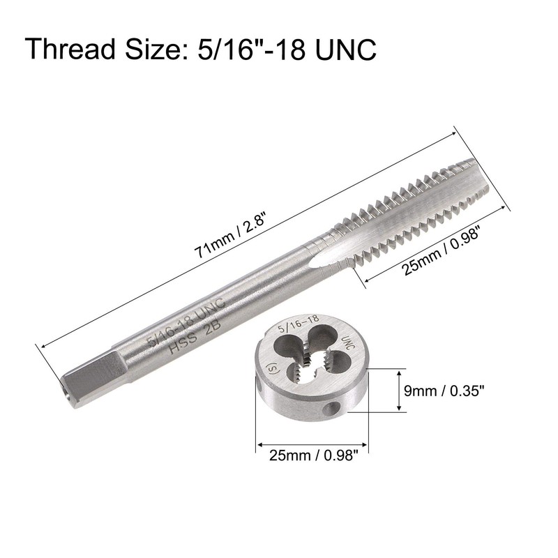 - Specifications: 5/16"-18 UNC tap and die set, right hand, 2B tolerance grade. Suitable for making or repairing male and female threads. Good for general purpose applications.