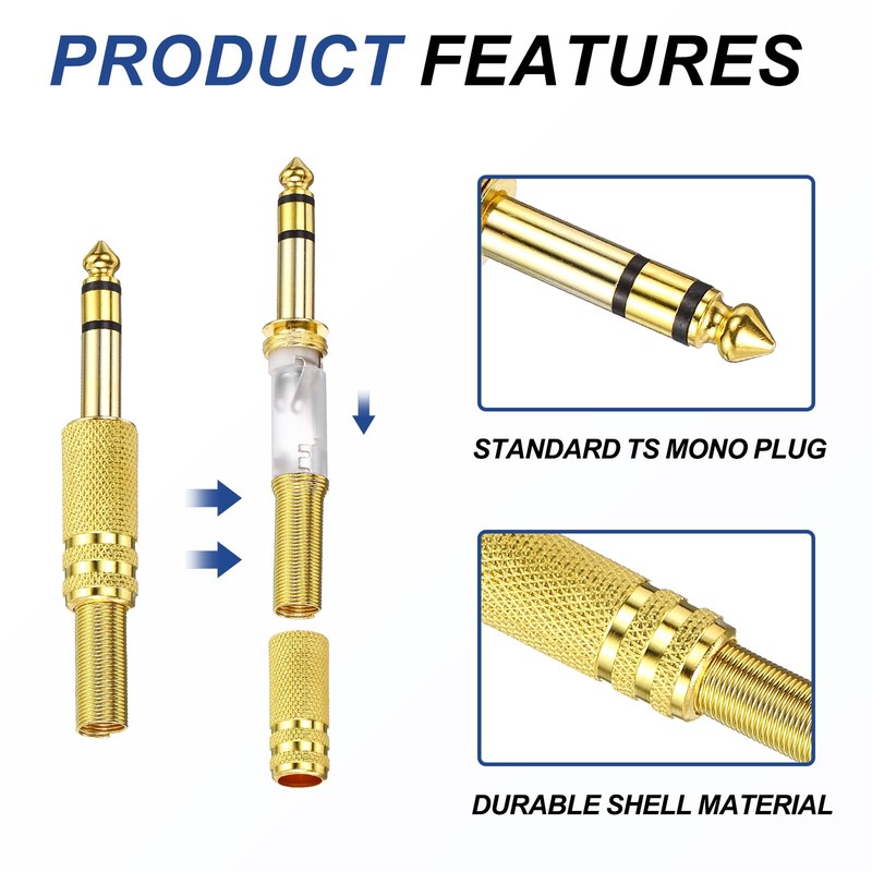 - Great Compatibility: This TS audio cable plug with standard 6.35mm (1/4") design, which could adapt to most audio devices that equipped with TS mono jack, very suitable for audio cable production. Outstanding Conductivity: Made from Zinc alloy gold plated material, which ensures excellent power conductivity, providing a stable and efficient sound signal transmission. Versatile Use: This TS male plug is very suitable for producing TS audio cable for devices like microphone, guitar, speaker, etc