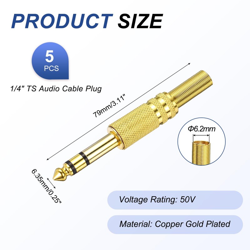 - TS6.35 Audio Cable Plug: Size: 6.35 x 79 mm / 0.25 x 3.11 inch (OD x L); Voltage Rating: 50V; Color: Gold; Material: Zinc Alloy Gold Plated;