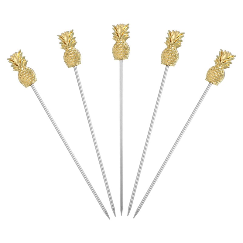 sourcing map 5 Pcs Stainless Steel Cocktail Picks, 4.2 Inch Martini Picks Fruit Sticks Metal Skewers Reusable for Drinks Olives Appetizers Fruit Decorative, Gold (Pineapple)