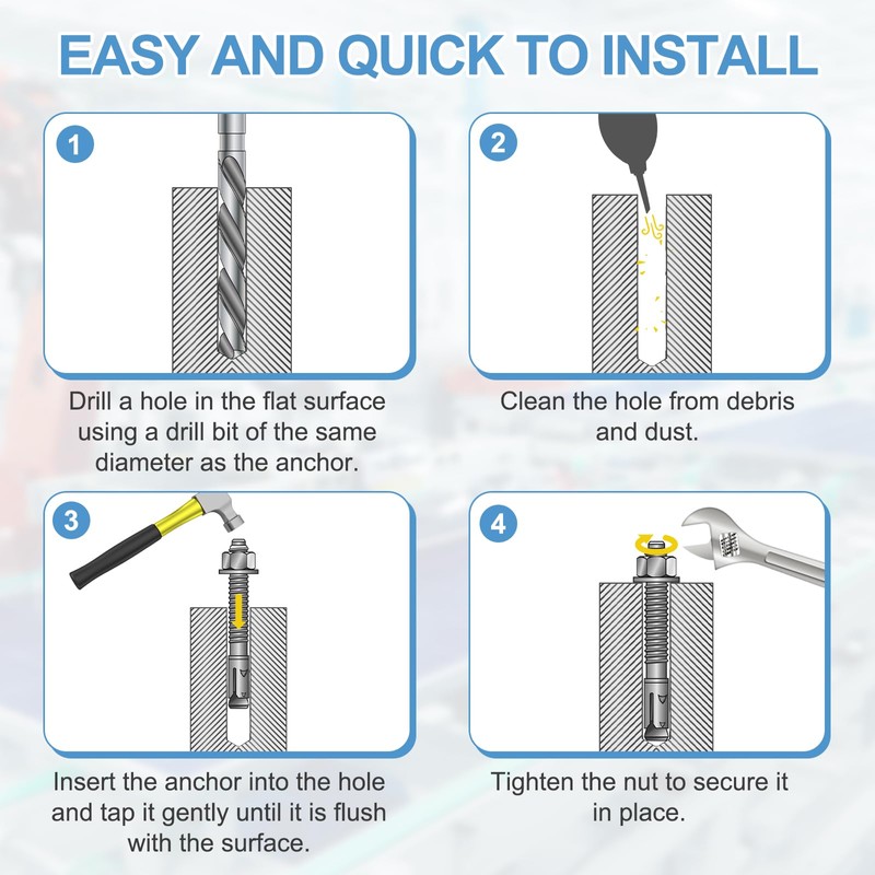 - The concrete anchors are easy to install, and no other special tools are required. First, use a drill bit with the same diameter as the anchors to drill a hole in the surface, insert it into the hole, and tap it gently until it is flush with the surface. Finally, tighten the nut to fix it in place.