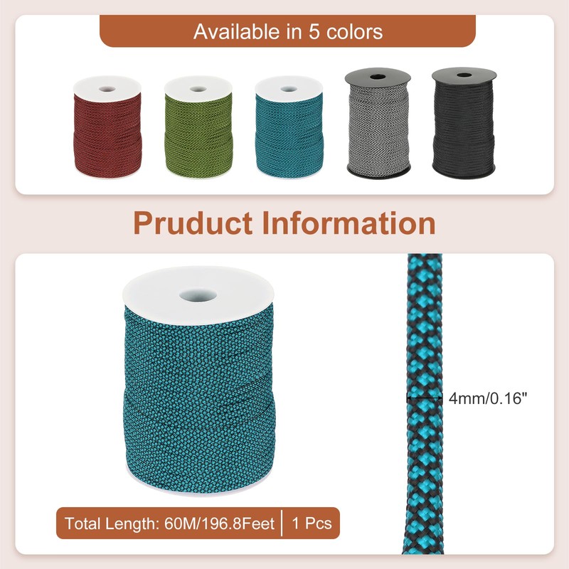 The paracord rope we provide here has a length of: 60M/200Feet, a diameter of: 4mm/0.16inches, color: blue/black