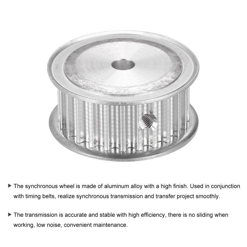The silver color synchronous wheel is made of aluminum alloy with a high finish. Used in conjunction with timing belts, realize synchronous transmission and transfer project smoothly. Widely used in mechanical transmission such as 3D printers, drilling machines, milling machines, gear machines, CNC lathes, etc.