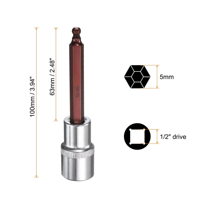 - Size - 5mm, 1/2" drive, Total Length: 100mm / 3.94"; Bit Length: 63mm / 2.48"; The beveled chamfer design can be easily, smoothly and accurately inserted to protect the drill bit and fasteners from damage