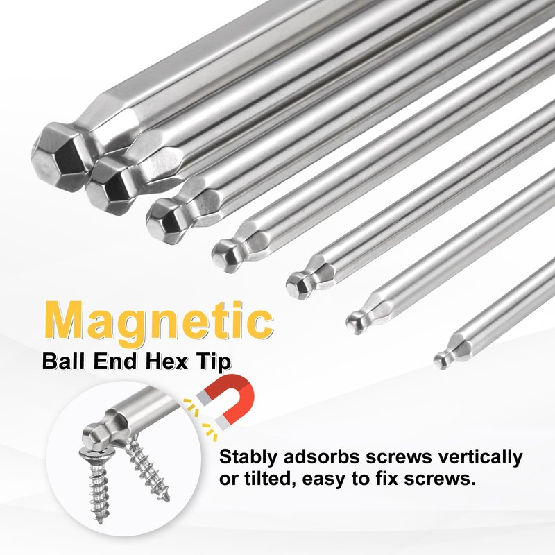 The ball end hex bits are designed with magnetism. Magnetic screw driver tip can absorb the screws vertically or obliquely stably and fix the screws easily, and it is easy to install on the screwdriver handle. Especially in a small space, it can complete the work more conveniently and improve efficiency.