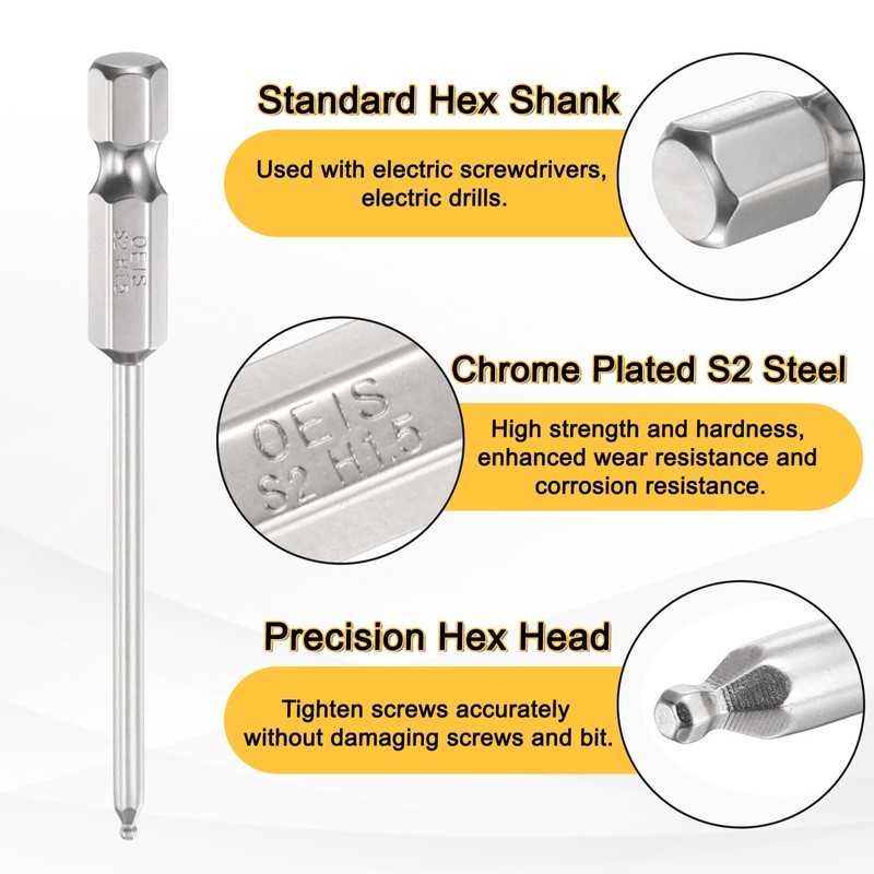 • Size - Magnetic ball end hex head size: H1.5 (1.5mm); hex shank size: 1/4"; total length: 75mm / 3"; hardness: HRC56-58 (The recognized stable hardness is around HRC60.). Each hex screwdriver bit is clearly engraved with the model number for easy identification.
