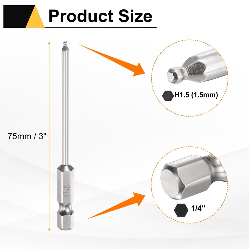 - Size - Magnetic ball end hex head size: H1.5 (1.5mm); hex shank size: 1/4"; total length: 75mm / 3"; hardness: HRC56-58 (The recognized stable hardness is around HRC60.). Each hex screwdriver bit is clearly engraved with the model number for easy identification.