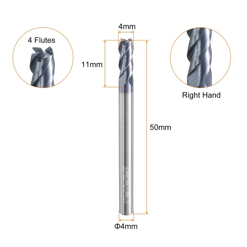 - Size - Cutting diameter: 4mm (right hand); shank diameter: 4mm; cutting length: 11mm; total length: 50mm (extra long); cutting hardness: HRC53-55; helix angle: 45 degree; number of flutes: 4 flutes. Make sure the end mill is suitable for the specific application and material being processed.