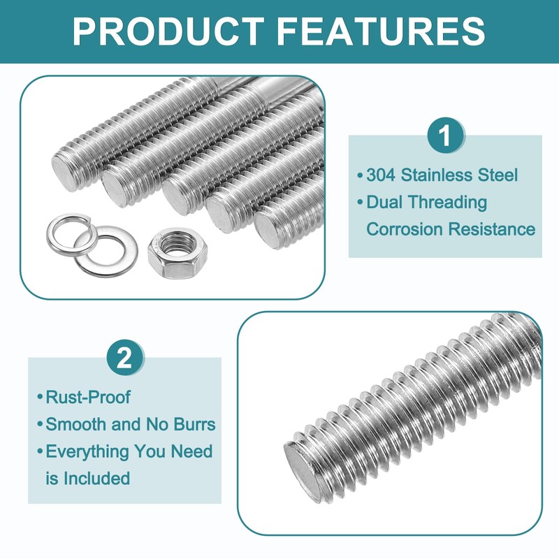 - [Material] Crafted from 304 stainless steel, these double-threaded stud bolts offer superior resistance to corrosion, rust, and oxidation. This ensures a long service life, even in challenging environments.
