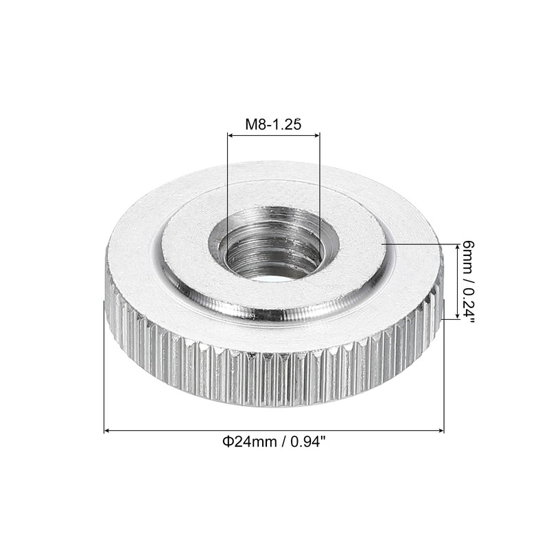 • Knurled Thumb Nut: Thread Size: M8-1.25; Head Dia: 24mm/0.94-inch; Small End Size: 16 x 5mm/0.63 x 0.2-inch(D*H); Height: 6mm/0.24-inch; Package Included: 5pcs x Knurled Thumb Nuts