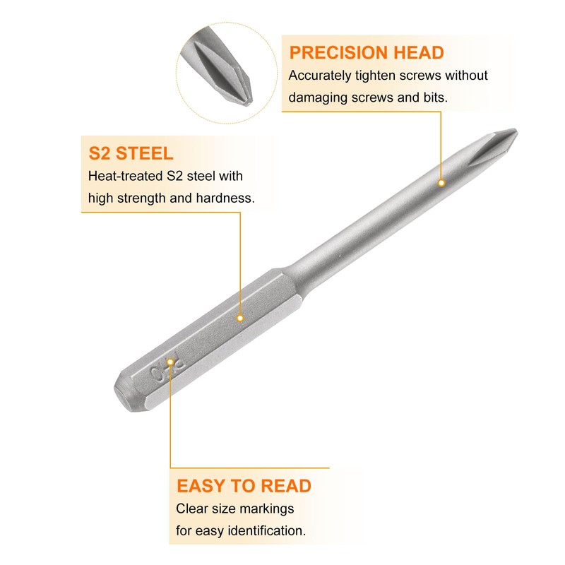 - Size - PH0; Total Length: 45mm / 1.77"; Shank: 4mm/ 5/32 inch hex shank; Phillips head drill bit specifically designed for driving screws into wood, metal, and other materials effortlessly. Can accurately tighten screws without damaging screws and screwdriver bits