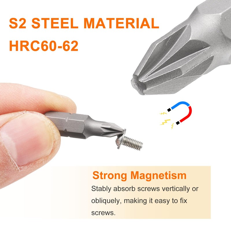 - Material - The screwdriver bits are made of specially heat-treated S2 steel with high strength and hardness (HRC58-62), durable and anti-bending, and the surface is sandblasting for enhanced grip and corrosion resistance