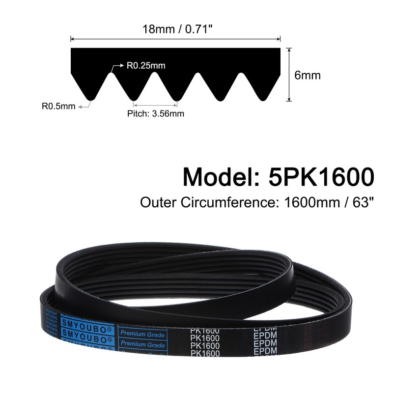 - Model: 5PK1600; outer circumference: 1600 mm (63 inches); width: 18 mm (0.71 inches); thickness: 5 mm (0.19 inches).