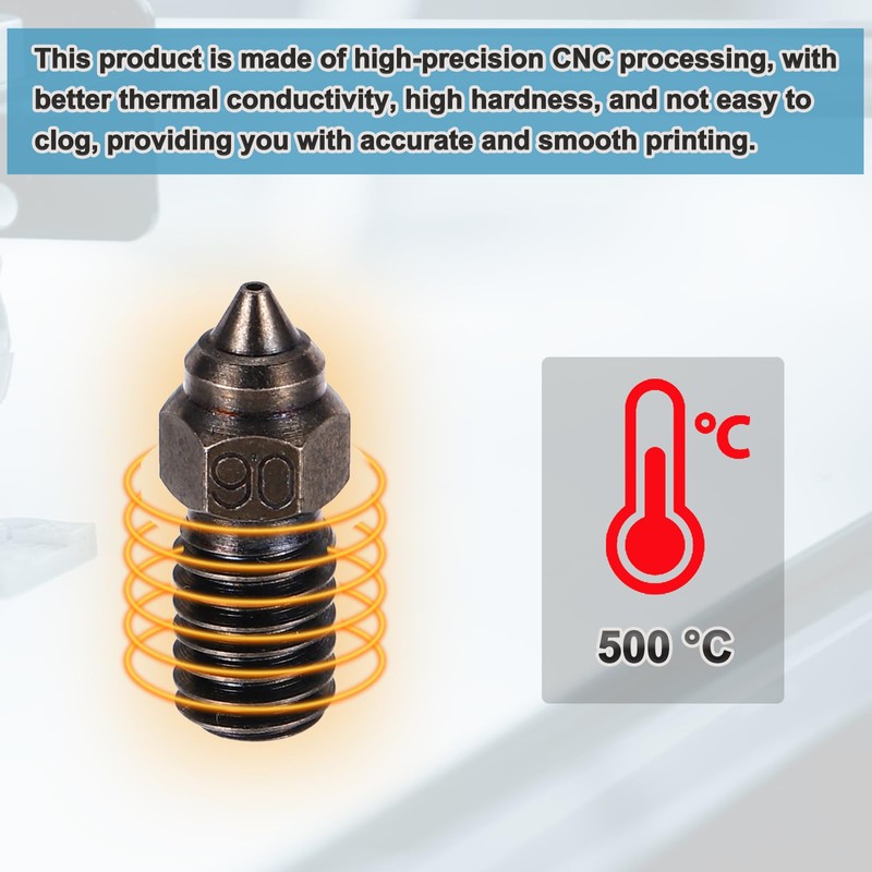 - The nozzles kit contains stable materials, high thermal conductivity, high thermal conductivity enables the filament to be heated evenly,The nozzles can withstand high temperature up to 500°C/932°F, fast thermal conductivity, make printing more stable; surface process with good electrical conductivity and anti-corrosion and rust, greatly reducing the adhesion between the filament and nozzle, extrusion is smoother.