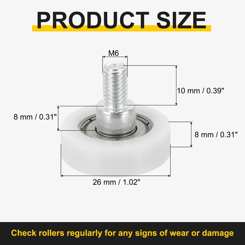 - Standard Size: Threaded rod size: M6; Threaded rod length: 10mm/0.39"; Wheel diameter: 26mm/1.02"; Step height: 6mm/0.24"; Wheel thickness: 8mm/0.31"; Package list: 6 drawer rollers