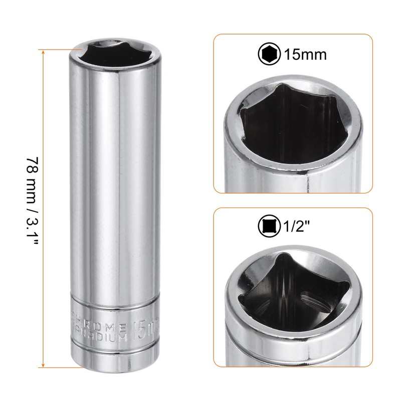 sourcing map 6-Point Socket 1/2" Drive 15mm Metric 3.1" Length 45# Steel Deep Sockets Full Polishing Chrome Sockets for Car Repair Mechanical Maintenance Home Use