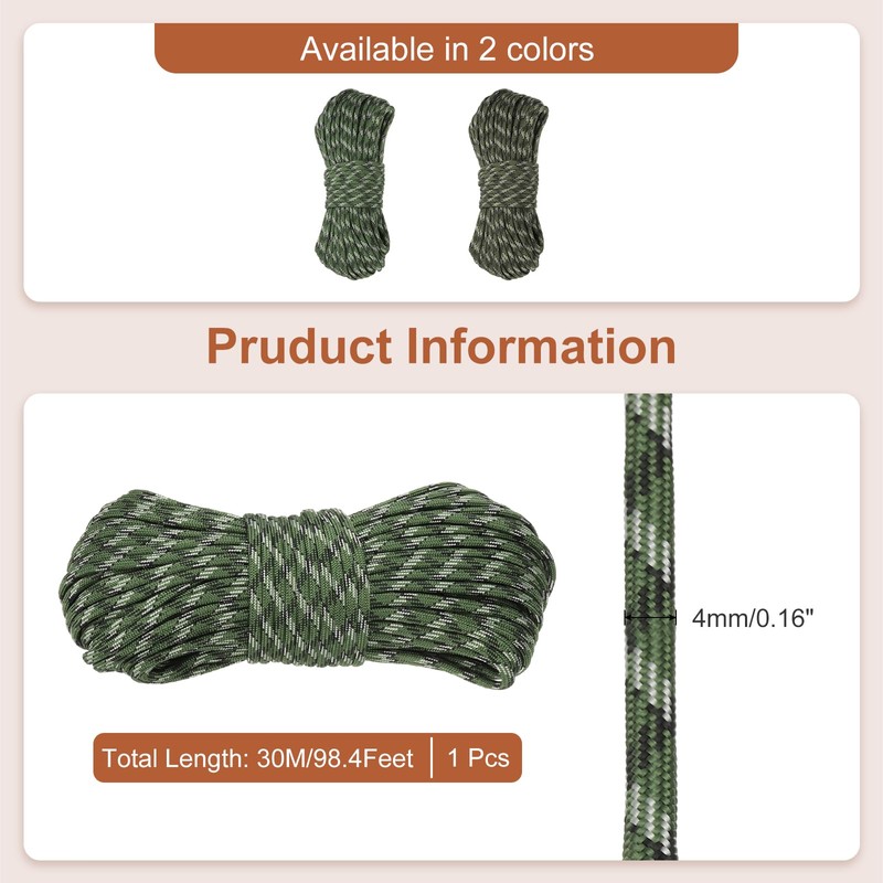 The paracord rope we provide here has a length of: 30M/100Feet, a diameter of: 4mm/0.16inches, color: army green camouflage