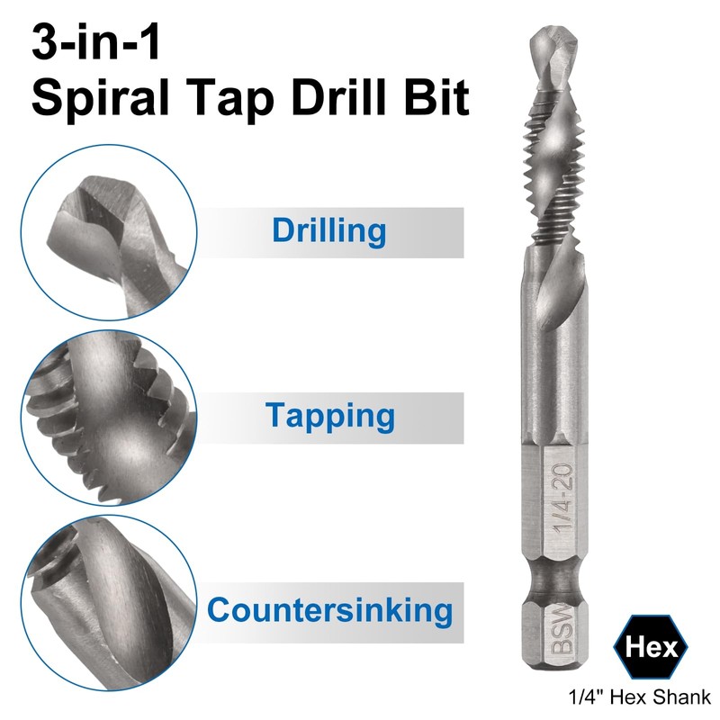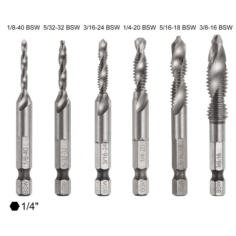 - Combination Drill and Tap Bit: Thread size: 1/8-40 BSW 5/32-32 BSW 3/16-24 BSW 1/4-20 BSW 5/16-18 BSW 3/8-16 BSW; hex shank size: 1/4"; drilling + tapping length: 30,36,29,31,32,26mm / 1.18",1.41",1.14",1.22",1.25",1.41", total length: 66,66,70,70,66,66mm / 2.6",2.6",2.8",2.8",2.6",2.6". Metric combination tap drill bit is used to create threaded holes, great for situations where both drilling and tapping are required. Can process both through holes and blind holes.