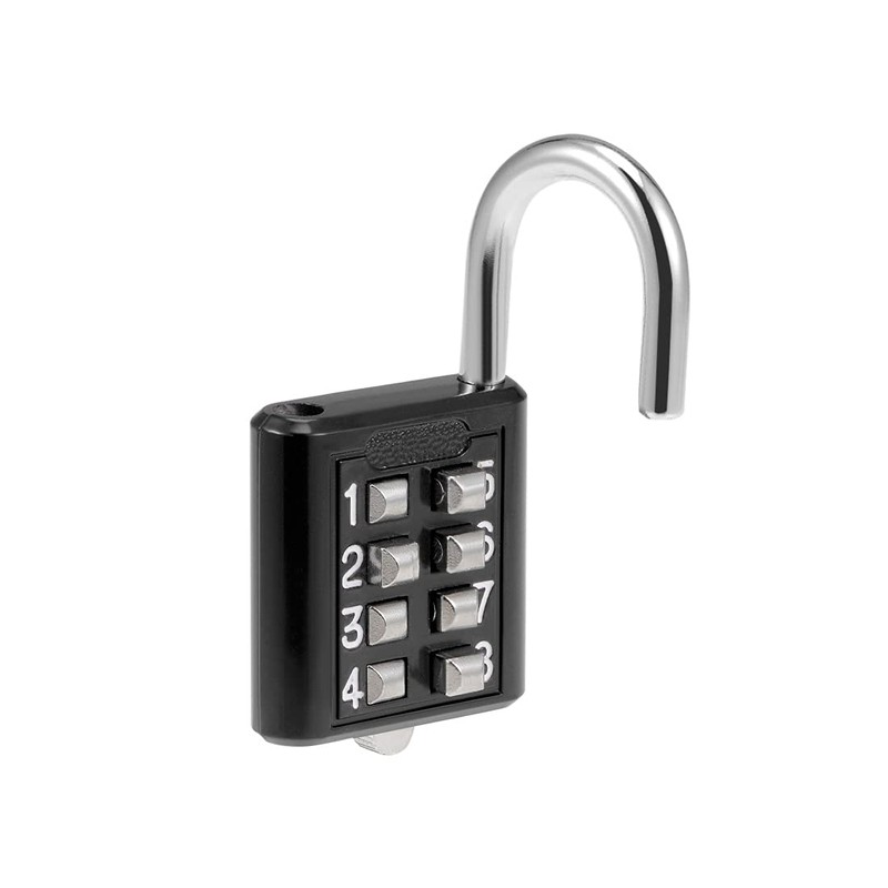 Quick and easy to open 8-digit push button padlock with 4-digit locking mechanism.