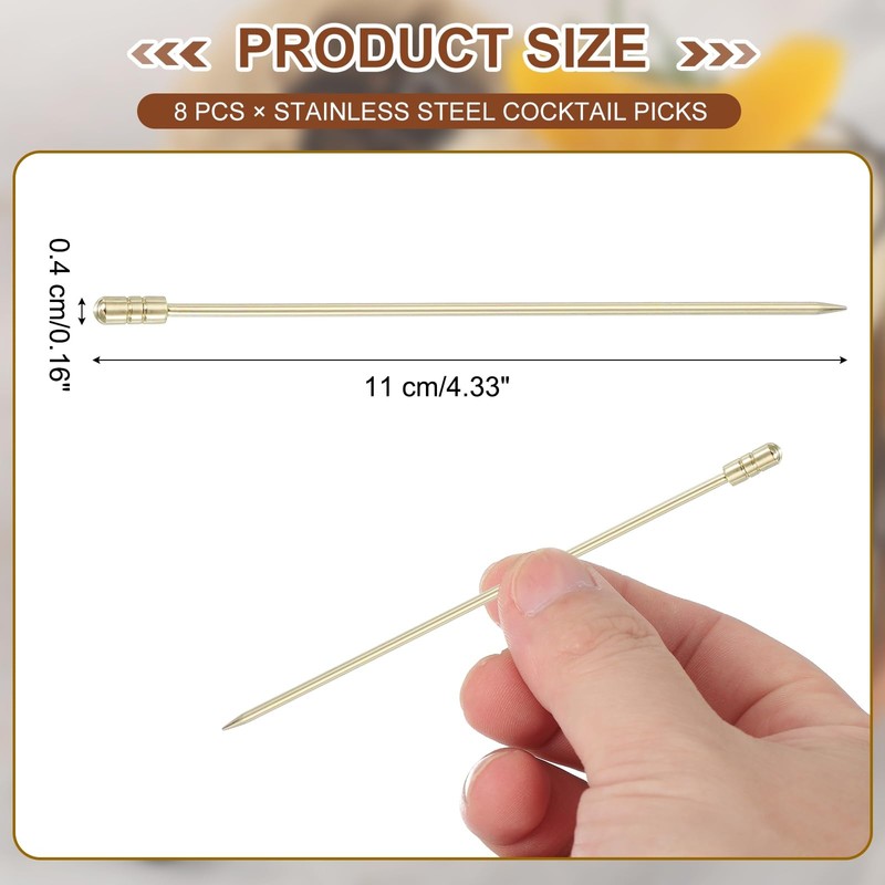 - Package & Size: You will receive 8 pcs stainless steel cocktail picks, measuring 11 x 0.4 cm/4.33 x 0.16 inch (L*W), which can be used as a cocktail decoration or snack sticks.