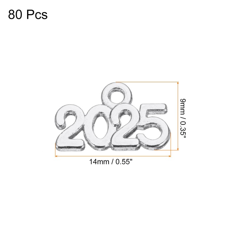 sourcing map 80pcs 2025 Graduation Year Charm 3D Metal Tassel Year Number Charm Year Pendant Mini for DIY Anniversary Jewelry Making Crafts, Silver