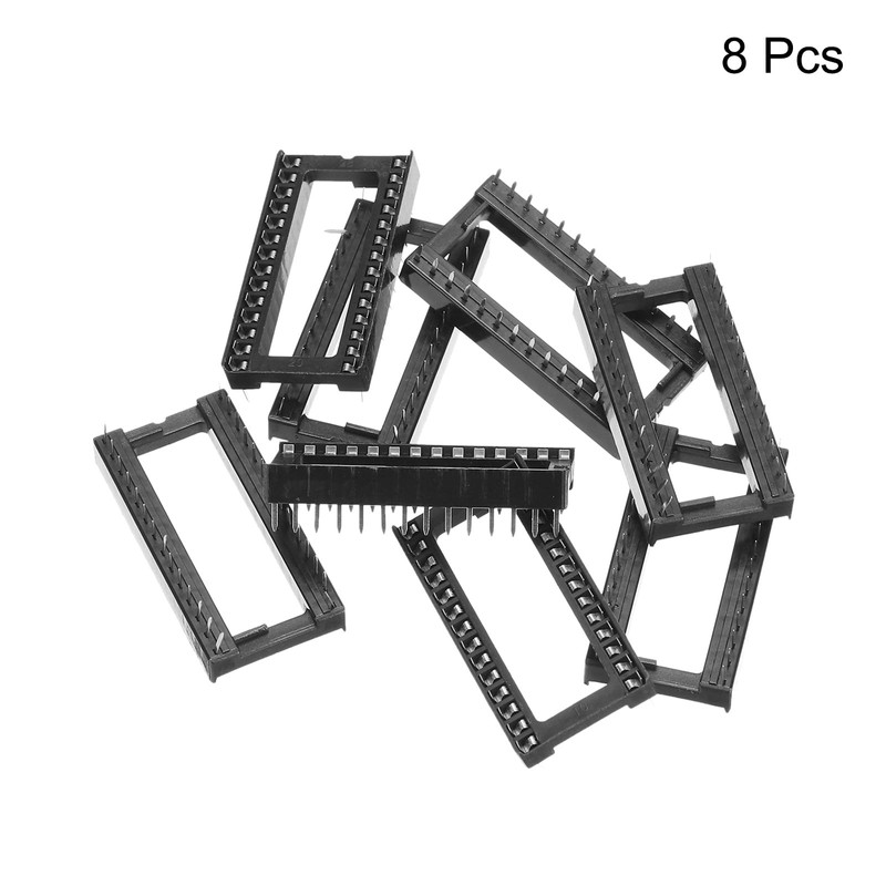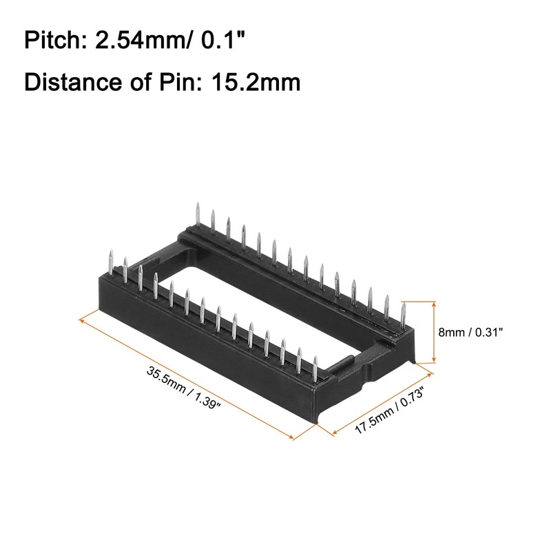 - Pitch: 2.54mm/ 0.1" Number of Pin: 28 Row Distance: 15.2 mm Material: Plastic, Metal Total Size: 35.5 x 17.5 x 8 mm/1.39"x 0.69"x 0.31"(L*W*H) Package Content: 8Pcs x DIP IC Chip Socket Adapter Circuit Chip