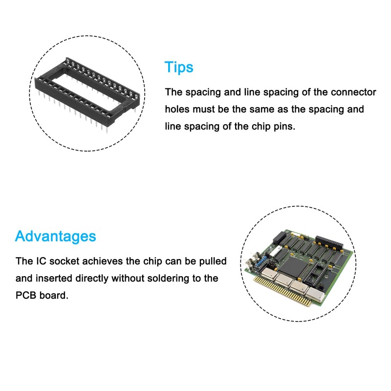 The IC socket achieves the chip can be pulled and inserted directly without soldering to the PCB board. It has heat resistant and good pin stability and can withstand repeated assembly and disassembly without damaging the chip.