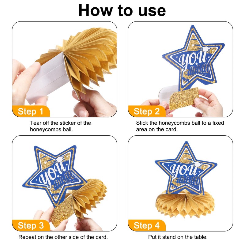 • How to use: Step 1, tear off the sticker of the honeycombs ball. Step 2, stick the honeycombs ball to a fixed area on the card. Step 3, repeat on the other side of the card. Step 4,put it stand on the table. Step 5,done.