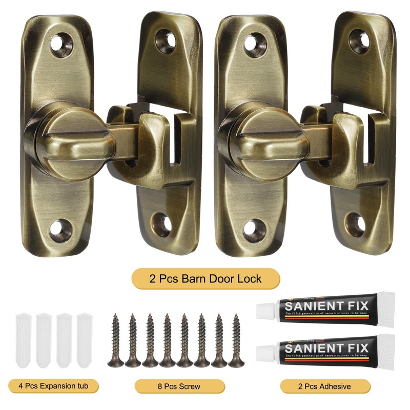 - Material: Zinc Alloy; Color: Bronze; Thickness: 2.3cm / 0.9inch; Hole Spacing: 6cm / 2.36inch; Door Lock Single Side Size: 8 x 2.5cm / 3.2 x 1inch(L x W);Package Contents: 2 Pcs x Barn Door Lock, 8 Pcs x Screw, 4 Pcs x Expansion tub, 2 Pcs x Adhesive, 4 Pcs x Auxiliary Stickers