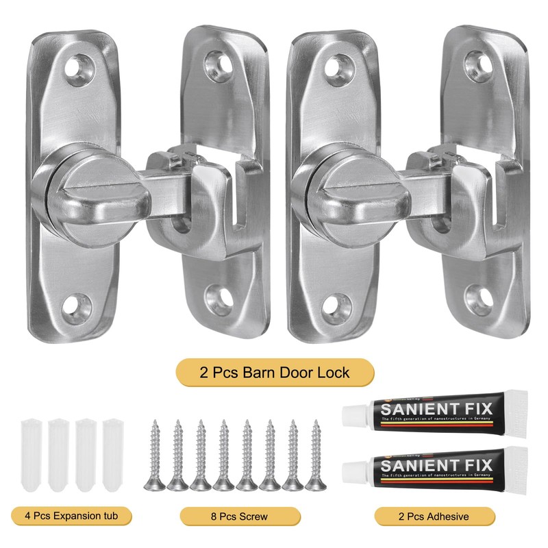 - Material: Zinc Alloy; Color: Silver; Thickness: 2.3cm / 0.9inch; Hole Spacing: 6cm / 2.36inch; Door Lock Single Side Size: 8 x 2.5cm / 3.2 x 1inch(L x W);Package Contents: 2 Pcs x Barn Door Lock, 8 Pcs x Screw, 4 Pcs x Expansion tub, 2 Pcs x Adhesive, 4 Pcs x Auxiliary Stickers