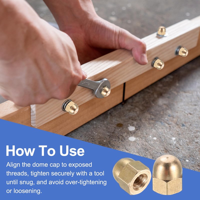 - These dome cap nuts are widely used in machinery, automobiles, construction, plumbing, furniture repair and maintenance, vehicle assembly, fencing, etc. They can also be used for decorative surface treatment of indoor and outdoor projects such as stairs, handrails, etc. The solid brass material ensures that it can last in harsh environments and is a good choice for indoor and outdoor applications.