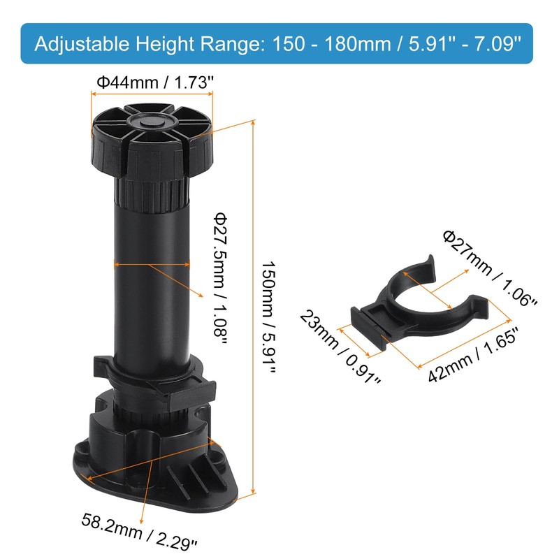 - [Basic Size] - Bottom Diameter:44mm / 1.73''; Top Diameter:58.2mm / 2.29''; Rod Diameter:27.5mm / 1.08'', With an adjustable height range of150 mm - 180 mm, these furniture legs provide versatility to accommodate different needs.