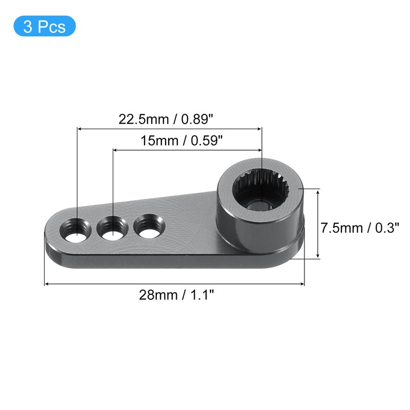 - Overall length: 28 mm/1.1 Inch; Thickness: 7.5 mm/0.3 Inch; Hole Center Distance(Measured From Hole Center To Hole Center): Far: 22.5 mm/0.89 Inch; Near: 15 mm/0.59 Inch; Mounting Aperture: 3mm/0.12 Inch; Servo Output Aperture: 6 mm/0.24 Inch; Material: Aluminum Alloy; Color: Deep Grey; In the package of: 3 Pcs x 25T Aluminum Servo Horn