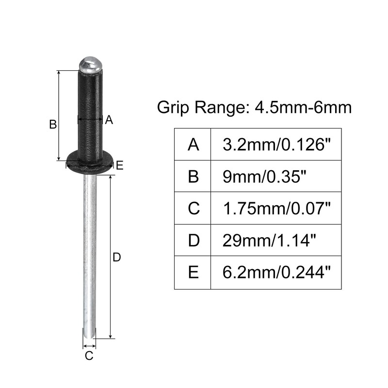 - [Size] - Rivet Handle Size: 3.2mm x 9mm/0.126" x 0.35"(D*L); Mandrel Size: 1.75mm x 29mm/0.07" x 1.14"(D*L); Brim Size: 6.2mm x 1.3mm/0.244" x 0.05"(D*T); Grip Range: 4.5mm-6mm. We have different sizes and colors of rivets available in order to meet your different equipment or furniture.