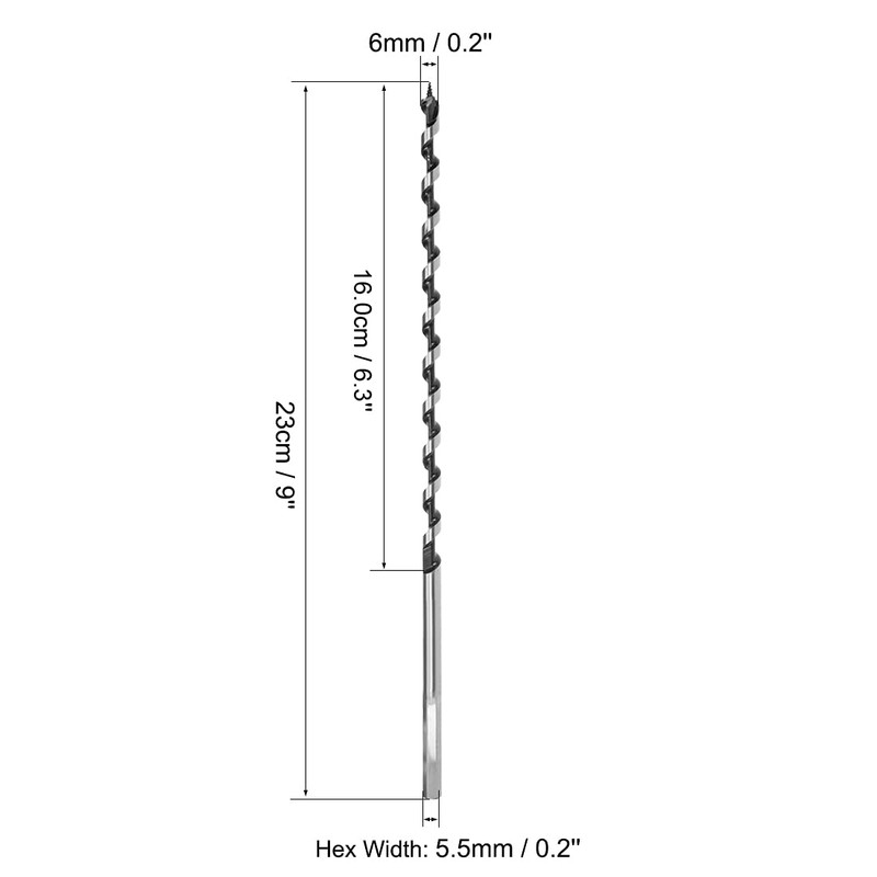 - [Cutting Dia.]: 6mm/0.2 inch; [Shank Width]: 5.5mm/0.2 inch; [Drill Depth]: 16.0cm/6.3 inches; [Total Length]: 23cm/9 inch