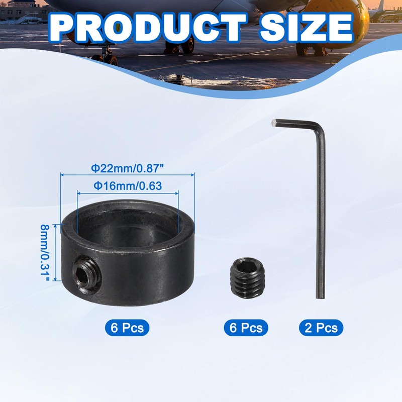 The Shaft Collar provided here is in the size of: Outer Diameter: 22 mm/0.87 Inch; Thickness: 8 mm/0.31 Inch; Applicable Shaft Diameter: 16 mm/0.63 Inch; Temperature Range: 0 ℉ to 250 ℉ (-17°C to 121°C); Packing List: 6 pcs x Shaft Collar Set + 2 pcs Hex Hex Wrench