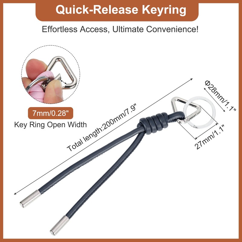 - The PU leather key chain for men women measures a size in 28mm/1.1" (Key Ring Dia.) 27mmx25mmx7mm/1.1"x1"0.28" (triangle ring charm length x triangle ring charm width x triangle ring open width) and 200mm/7.9" (total length).