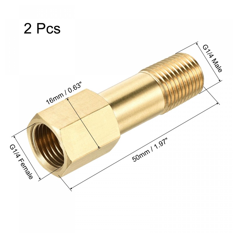 - Brass pipe fitting, we provide here, are in the size of: Material: Brass; Color: Golden Tone; Thread Size: G1/4 Female to G1/4 Male; Size: 50 x 16mm / 1.97 x 0.63 inch (L*W)