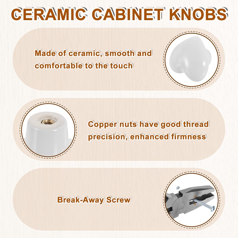 - Material: Ceramic cabinet knobs are made of ceramic, which is smooth, delicate, comfortable to the touch, wear-resistant, and durable. Copper nuts have good thread precision, enhanced firmness; Corrosion resistance, and strength