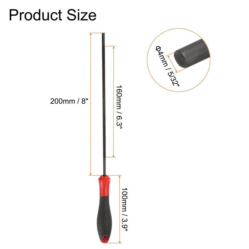 - Size - The chainsaw sharpening file measures a diameter of 4mm (5/32-inch), a filing length of 200mm (8-inch), a total length of 300mm (11.8-inch) and a handle length of 100mm (3.9-inch).