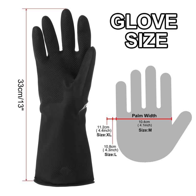 - The latex industrial glove provides here,is in size of: Overall Length: 33 cm (13 inch), Palm Width: 11.2 cm ( 4.4 inch); In the package of: 8 Pair x Chemical Resistant Latex Gloves