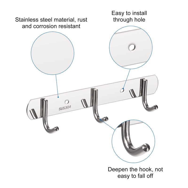 1. Made of good hardness 304 stainless steel material, it is durable and sturdy, not easy to deform. Rust and corrosion resistant, the wall hook is water proof and has a long service life.
