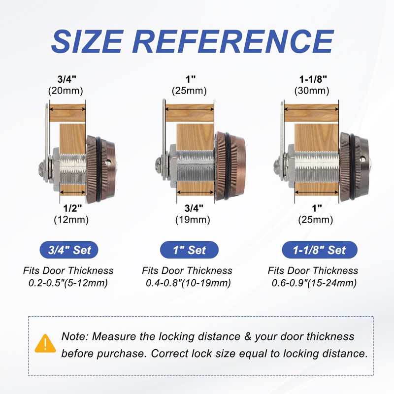 The combination cam lock we provide here outer diameter: 38 mm / 1.5 Inch; cylinder diameter: 19 mm / 0.75 Inch; cylinder length: 20 mm / 0.79 Inch; applicable board thickness: 5-12 mm / 0.2-0.5 Inch; fit max panel thickness: of 12 mm / 0.47 Inch; length from the center to the end of the bolt hole: 38 mm / 1.5 Inch