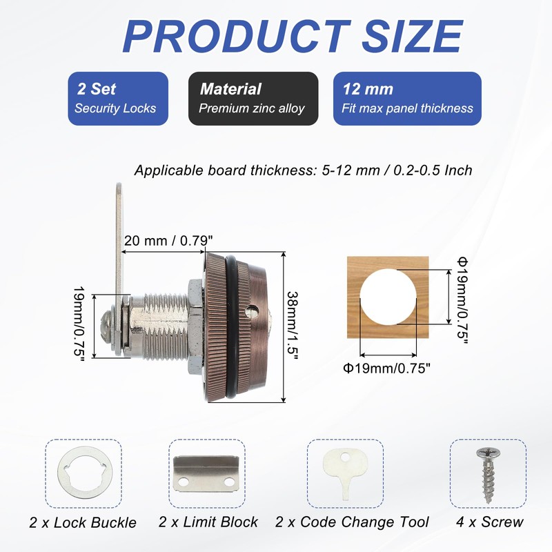 - The combination cam lock we provide here cylinder diameter: 19 mm / 0.74 Inch; cylinder length: 20 mm / 0.79 Inch; In the package of: 2 x Security Locks, 2 x Lock Buckle, 2 x Limit Block, 2 x Code Change Tool, 4 x Screw (Please Check Your Need Size Before Purchase)