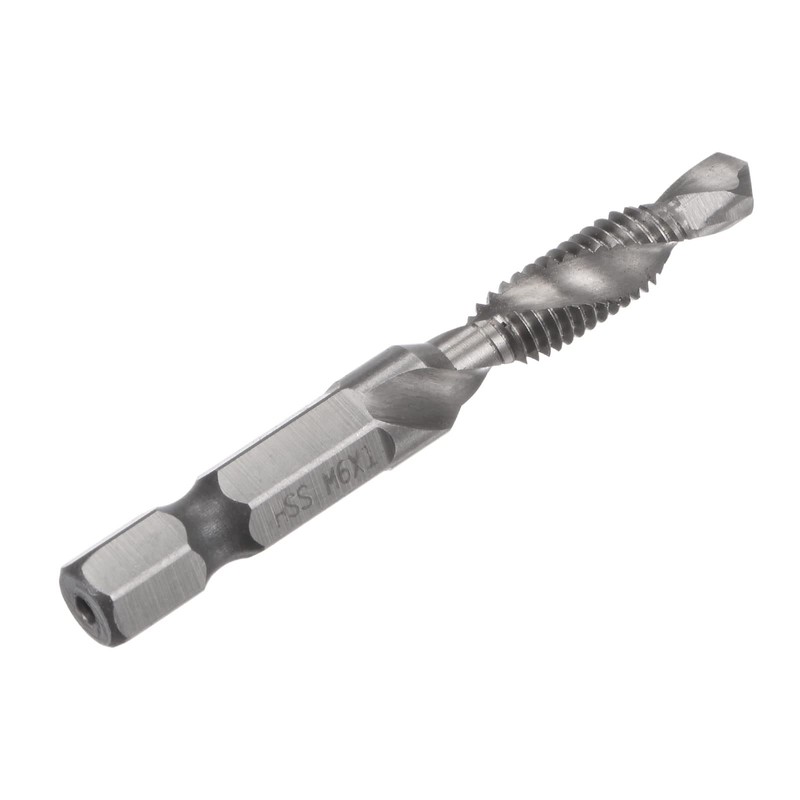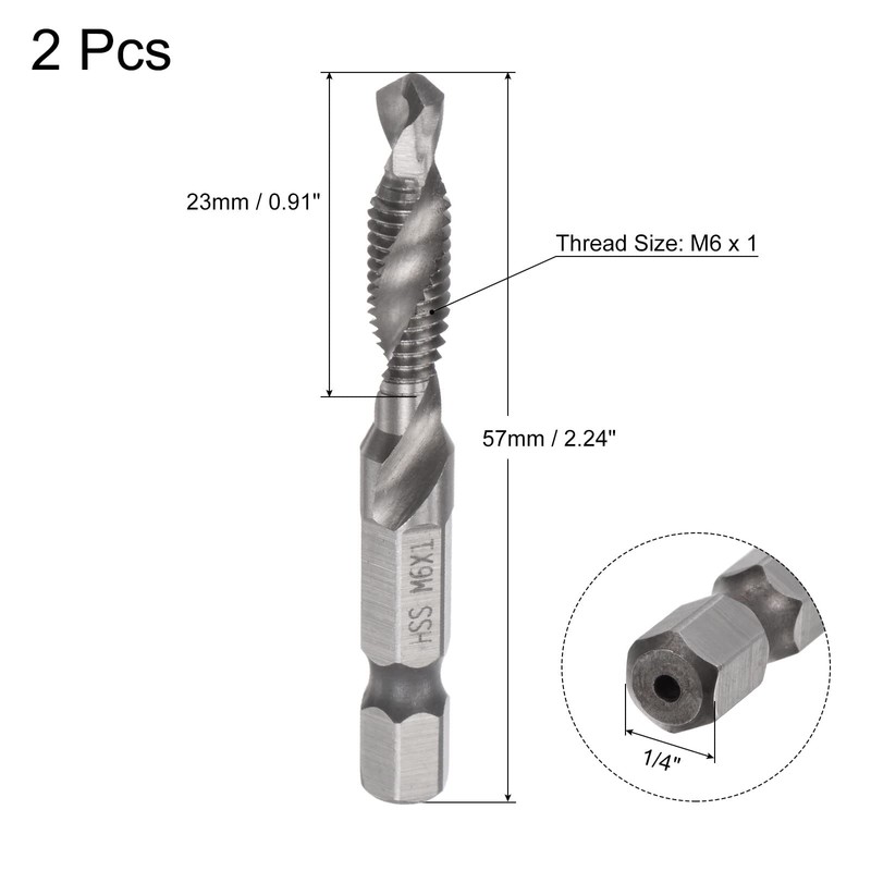 • Combination Drill and Tap Bit: Thread Size: M6 x 1; Hex Shank Size: 1/4". Combination drill and tap bit set can complete hole drilling, tapping, deburring and countersinking. One-step operation greatly saves processing steps and improves working efficiency.