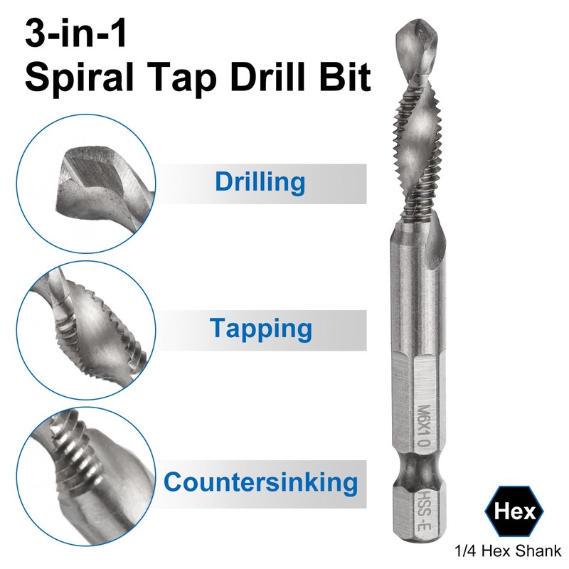 - Combination Drill and Tap Bit: Thread size: M6 x 1; hex shank size: 1/4"; drilling + tapping length: 25mm / 0.98"; total length: 66mm / 2.6". Metric combination tap drill bit is used to create threaded holes, great for situations where both drilling and tapping are required. Can process both through holes and blind holes.