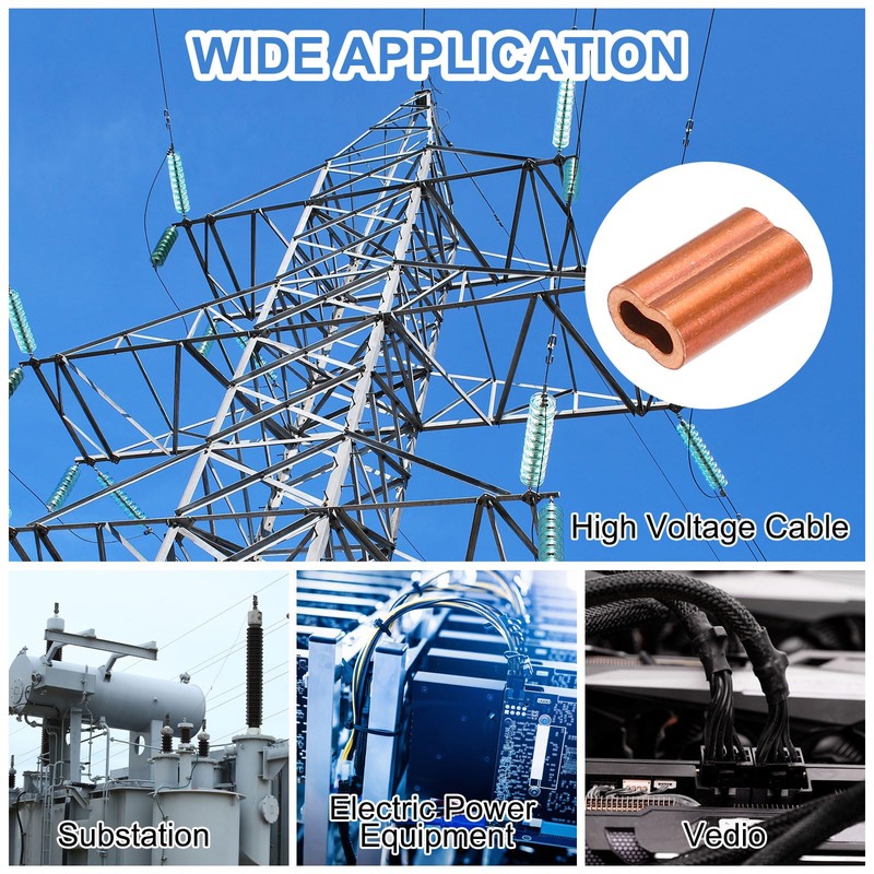 The Copper duplex oval crimp sleeve is used to crimp and fix the end of wire rope, cable, or wire, suitable for machinery, power equipment, high voltage cable, tunnel cable, fishing crimp sleeves, mining cables, substation, railway, ship, aviation, home appliances, computer or other automation equipment.