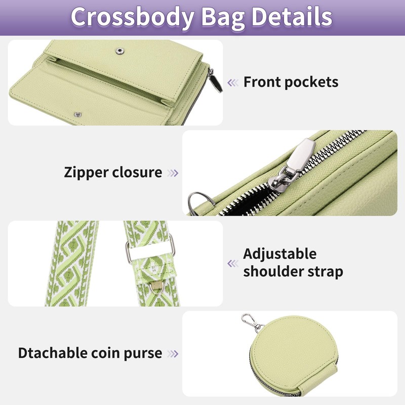 Phone Pouch & Wallet in One: 1coin bag+1 crossbody phone purse has 1 front phone pocket,2 inner compartments,1 inner middle zip pocket, and 4 card slots; Built-in wallet with card slots and money pocket for convenient access; The phone bag can hold a 6.7" cellphone below.