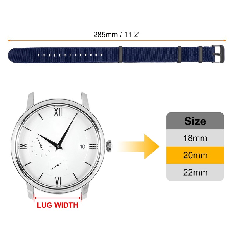 - Size - Watch Bands Width: 20mm / 0.79", Total Length: 285mm / 11.2", Package Included: 1pcs x Nylon Watch Band.